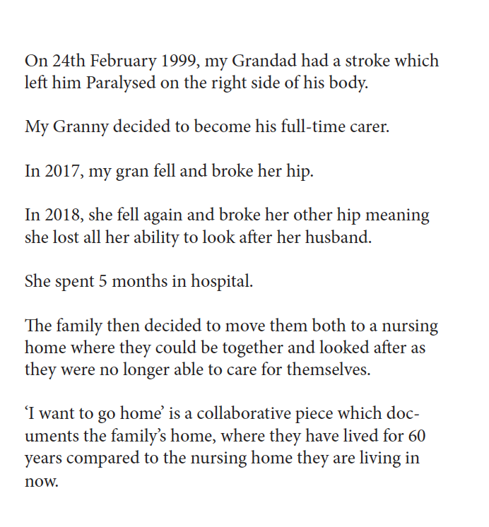 I want to go home is a personal and collaborative piece of work between Gabrielle and her grandparents, documenting their home environments and how it can suddenly change. The images are made up of abstract and portrait work, some of which captures the emptiness of the family home. Her intentions for the body of work is to create images that altogether with the context holds a lot of power and emotion and a message that we should be grateful for the loved ones we are surrounded by. This series is a personal archive that has great meaning not just to Gabrielle herself but also the rest of her family as it captures a certain part within our lives of which is upsetting as her granny just wants to come home.